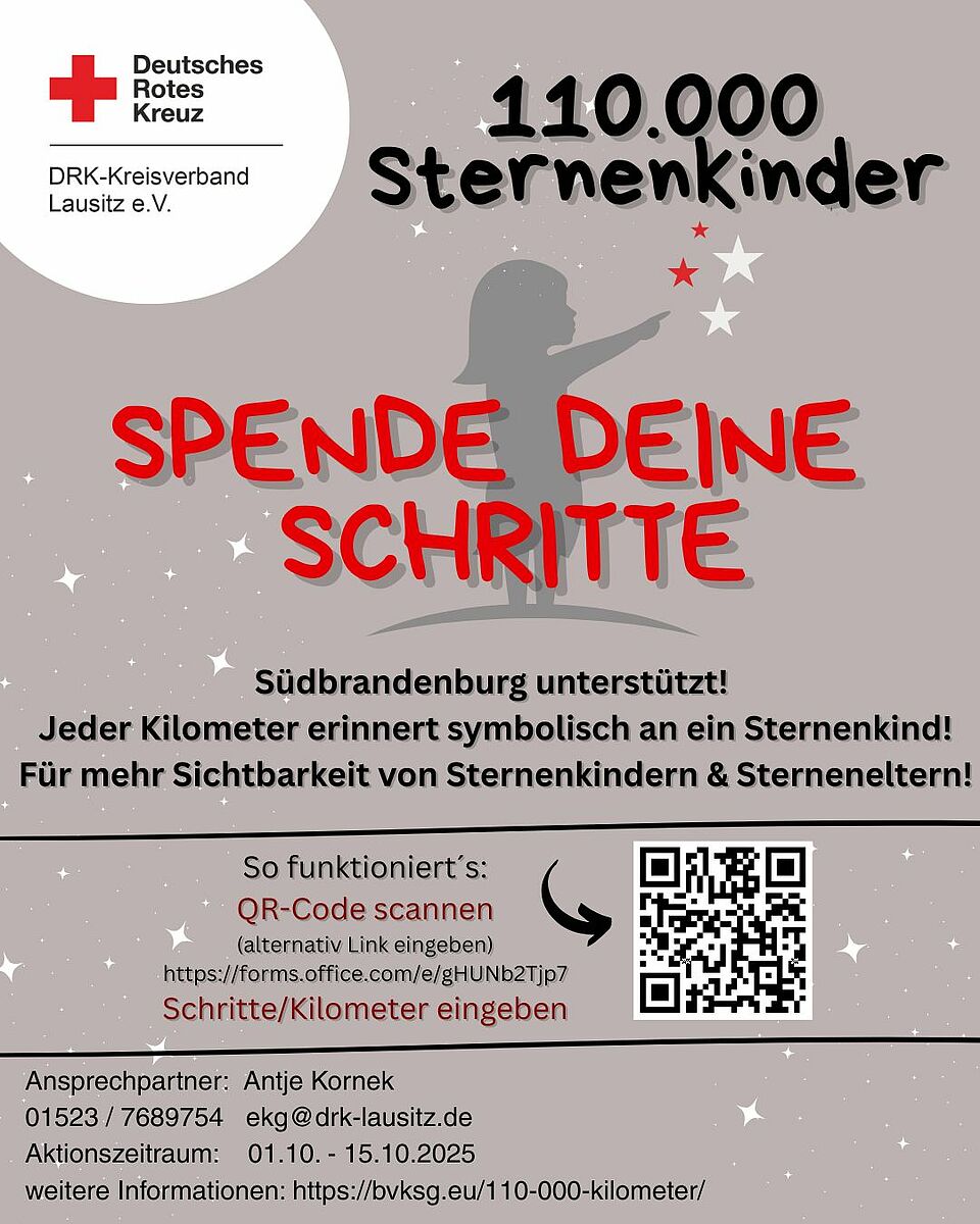 Die Idee hinter der Aktion ist einfach, aber symbolstark: Vom 1. bis 15. Oktober 110.000 Schritte gehen, für jedes Sternenkind einen. „Ob zu Fuß, per Rad, mit dem Rollator, im Rollstuhl, auf dem Pferd oder Wasser – jeder Schritt, jeder Kilometer, der unmotorisiert zurückgelegt wird, zählt. Ziel ist es, möglichst viele Menschen zur Teilnahme zu motivieren und gemeinsam ein Zeichen des Mitgefühls und der Erinnerung zu setzen“, erläutert Antje Kornek, Leiterin der Eltern-Kind Gruppen beim DRK-Kreisverband Lausitz. Im Rahmen der Gruppen gibt es inzwischen auch ein Angebot für Eltern oder Angehörige von Sternenkindern.